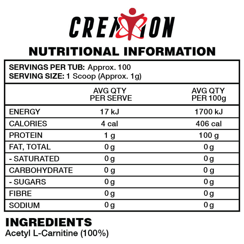 Creation Supplements AlcaPure Acetyl L-Carnitine is a powerful fat metaboliser designed to support weight loss and improve energy levels. Each serving contains 100g of pure Acetyl L-Carnitine, a more bioavailable form of the essential amino acid L-Carnitine.