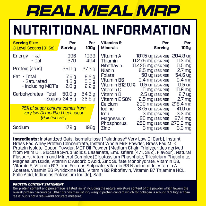 Each 91.5g serving (3 scoops) packs 370 calories, 25g of high quality protein, 7.5g of fats (including 2g of MCTs for quick, clean energy), and 50g of carbohydrates, sourced primarily from low-GI isomaltulose and instantised oats. This balanced macro profile is ideal for fuelling your day with steady energy, whether you’re aiming for weight management, muscle building, or simply staying energised.