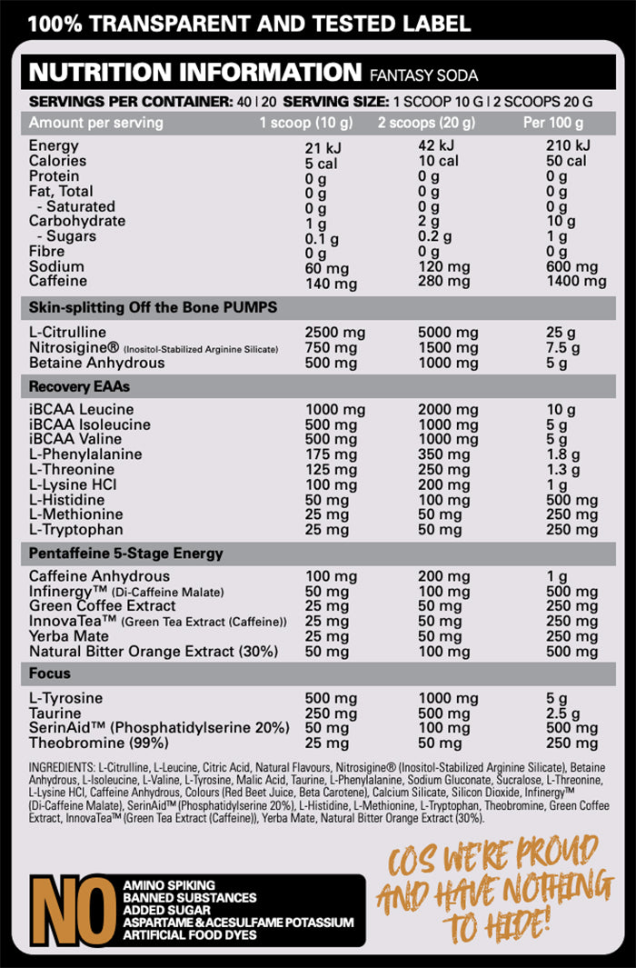 The “Skin Splitting Off The Bone PUMPS” blend contains L-Citrulline, Nitrosigine and Betaine Anhydrous covering muscle pumps from a three-pronged approach, plus a world class nootropic “Focus” blend with delicious doses of L-Tyrosine and SerinAid to dial you in like never before!