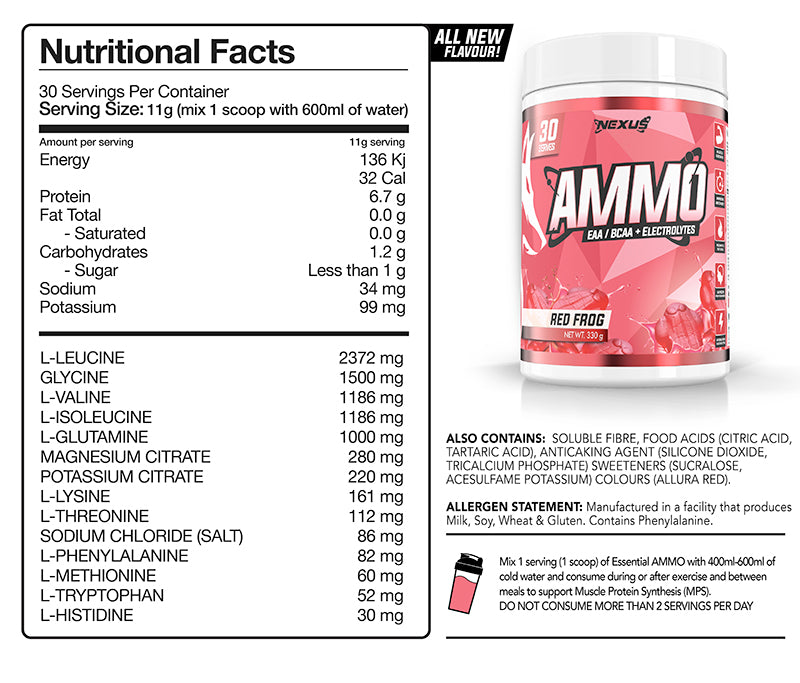 Ammo Aminos by Nexus comes in four delicious flavours: Arctic Slushie, Red Frog, Grape Xplosion, and Kiwi Strawberry. These flavours make it easy to incorporate Ammo Aminos into your diet and enjoy the benefits of essential amino acids without compromising taste.