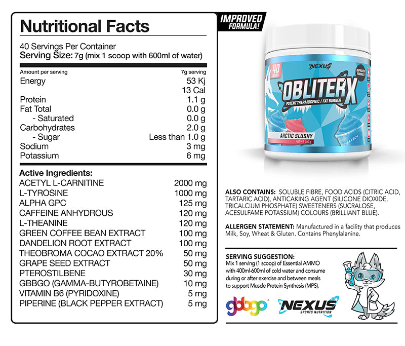 Nexus ObliterX is a thermogenic powder expertly formulated to support your body composition goals. With a potent blend of ingredients, this supplement helps enhance metabolism and optimise energy use, making it an excellent companion for your fitness journey. Key ingredients include Acetyl-L-Carnitine, L-Tyrosine, Alpha GPC, Caffeine Anhydrous, and L-Theanine.
