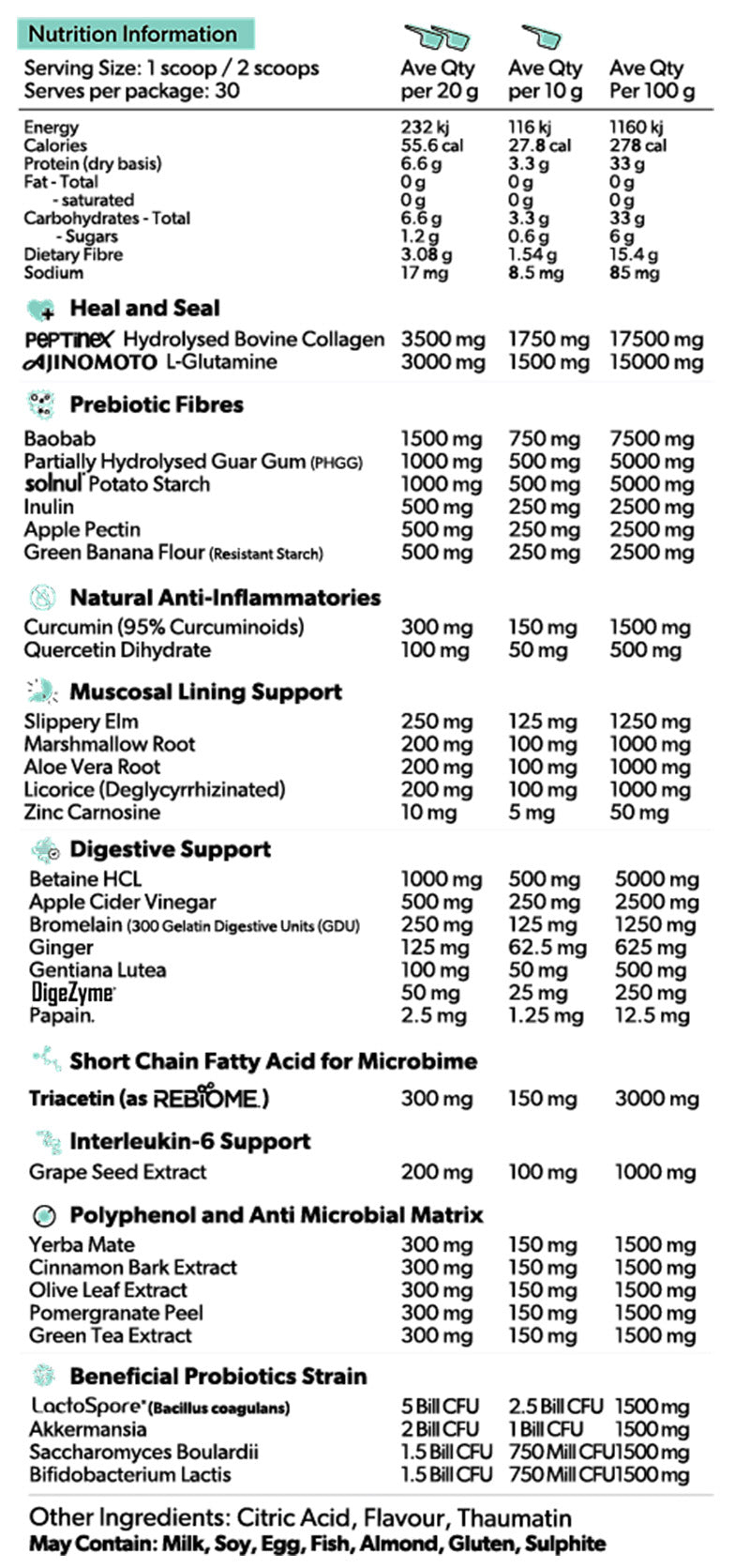 One of the standout features is the Heal & Seal Matrix, pairing hydrolysed collagen with L-Glutamine to help support the gut barrier, something many people overlook when trying to improve digestion. Paired with soothing ingredients like Slippery Elm, Marshmallow Root, Aloe Vera, and Zinc Carnosine, it’s designed to help create a calmer, more resilient digestive environment.