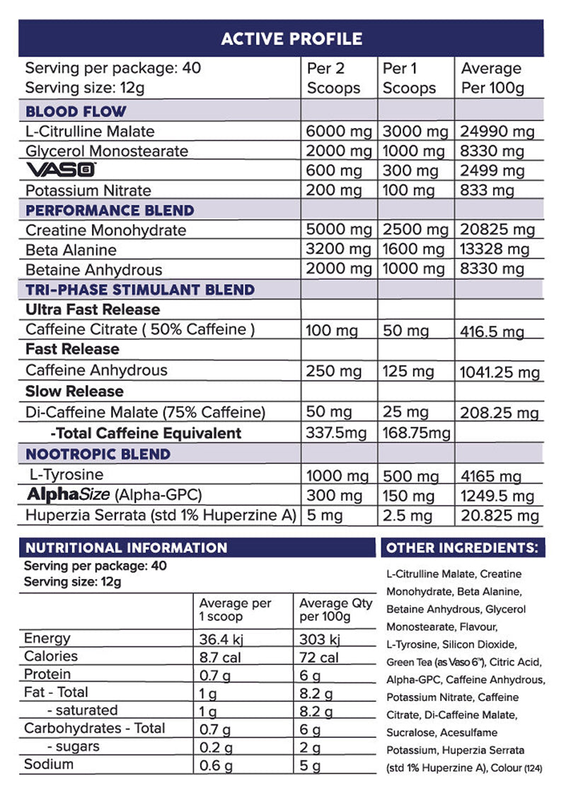 For performance, each 2-scoop serve includes 5000mg of Creatine Monohydrate, 3200mg of Beta Alanine, and 2000mg of Betaine Anhydrous, ensuring strength, power, and endurance are at their peak.