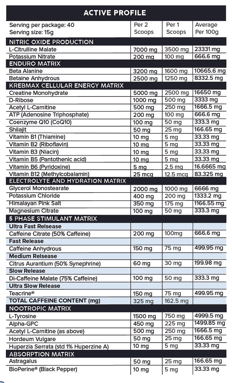 The five-phase stimulant matrix delivers a precise release of energy from ultra-fast to ultra-slow, with a total caffeine content of 325 mg per two scoops. The inclusion of TeaCrine® and Di-Caffeine Malate helps extend the energy curve without the crash, keeping you focused and alert during your entire session.