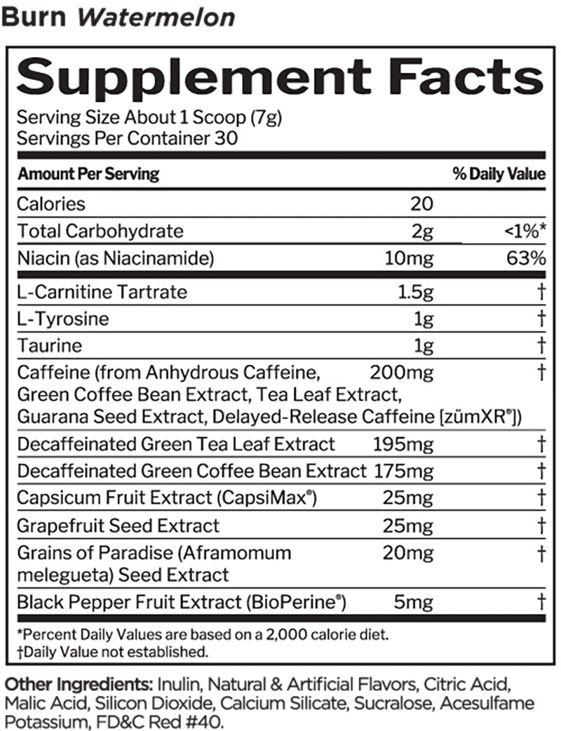 Each serving delivers a precise combination of L-Carnitine Tartrate, L-Tyrosine, and Taurine, supporting energy metabolism and mental focus. With 200mg of caffeine from a mix of anhydrous caffeine, green coffee bean extract, tea leaf extract, guarana seed extract, and delayed-release caffeine (zümXR®), Rule 1 Burn provides smooth, sustained energy to help power through your workouts or daily routine.