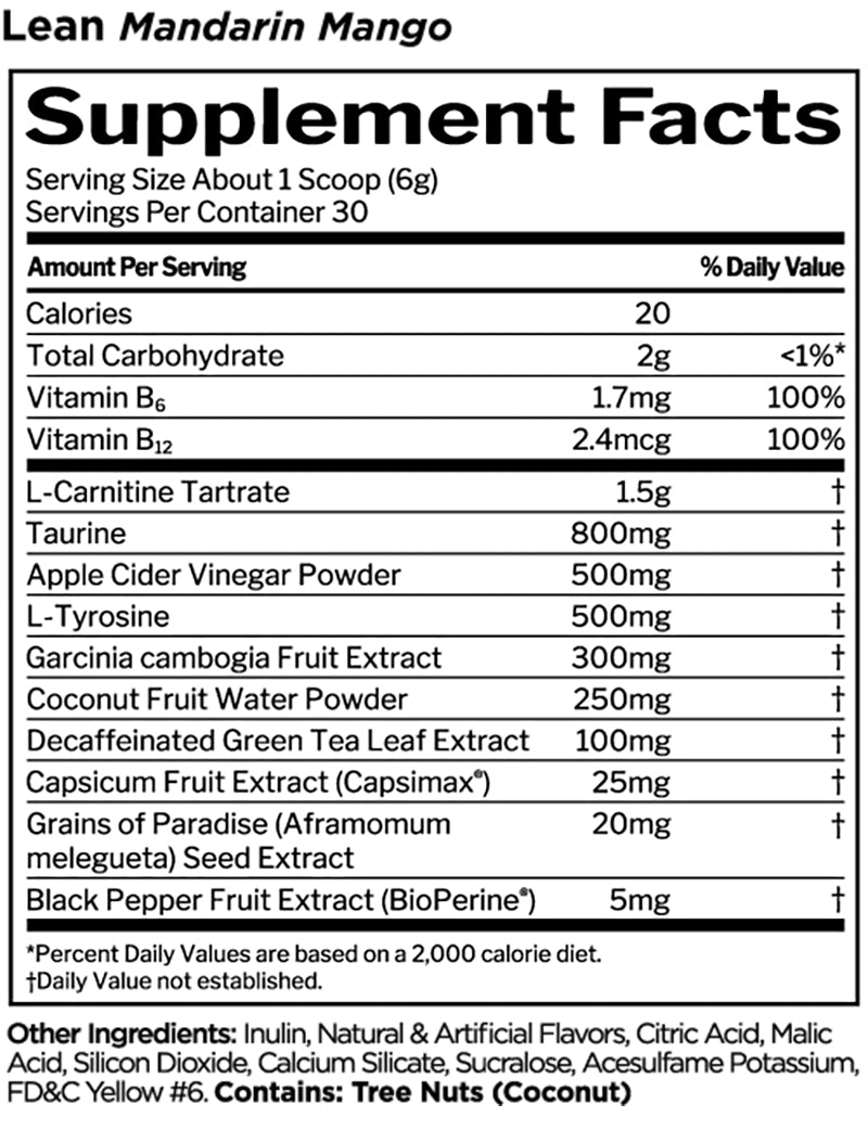 Each scoop features L-Carnitine Tartrate, Taurine, and L-Tyrosine, helping to support energy metabolism and overall performance. To further complement your efforts, Rule 1 Lean includes apple cider vinegar powder, Garcinia cambogia fruit extract, coconut fruit water powder, and a blend of premium botanical extracts, such as decaffeinated green tea, CapsiMax® capsicum fruit extract, grains of paradise, and BioPerine® black pepper extract.