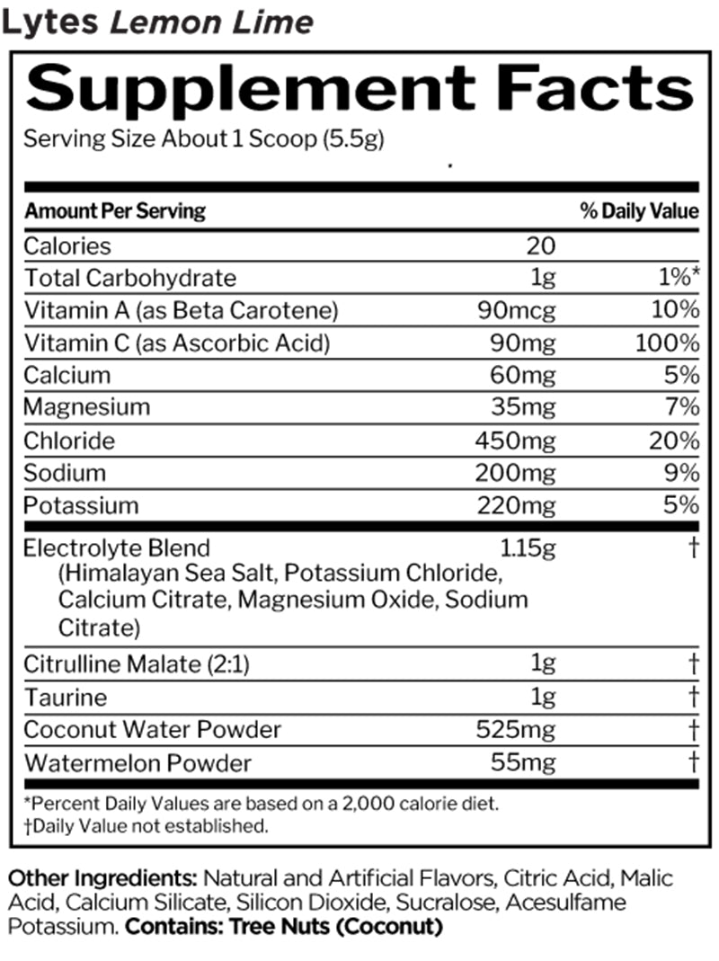 Rule 1 Lytes also includes 1g of Citrulline Malate (2:1) and 1g of Taurine, both of which enhance blood flow and improve endurance. These ingredients help deliver nutrients and oxygen to your muscles more efficiently, reducing fatigue and boosting overall performance. Additionally, 525mg of Coconut Water Powder and 55mg of Watermelon Powder provide natural hydration and essential nutrients, making Rule 1 Lytes a refreshing and effective way to stay hydrated.