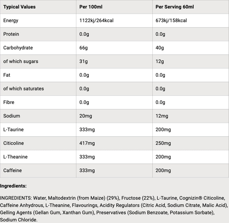 Enhancing this high energy blend, the gel includes a potent mix of nootropics and stimulants: 200mg of L-Taurine, 250mg of Citicoline, 200mg of L-Theanine, and 200mg of Caffeine. L-Taurine supports cardiovascular function, Citicoline boosts neurological health and cognitive function, L-Theanine promotes relaxation without drowsiness, and Caffeine sharpens focus and alertness. Together, these additions help maintain a high level of mental clarity and focus throughout your performance, combating the mental fatigue that often accompanies physical exhaustion.