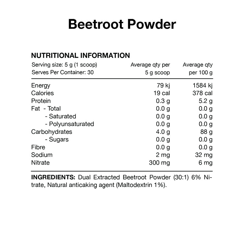 - Ingredients: Dual Extracted Beetroot Powder (30:1) 6% Nitrate, Natural anticaking agent (Maltodextrin 1%)