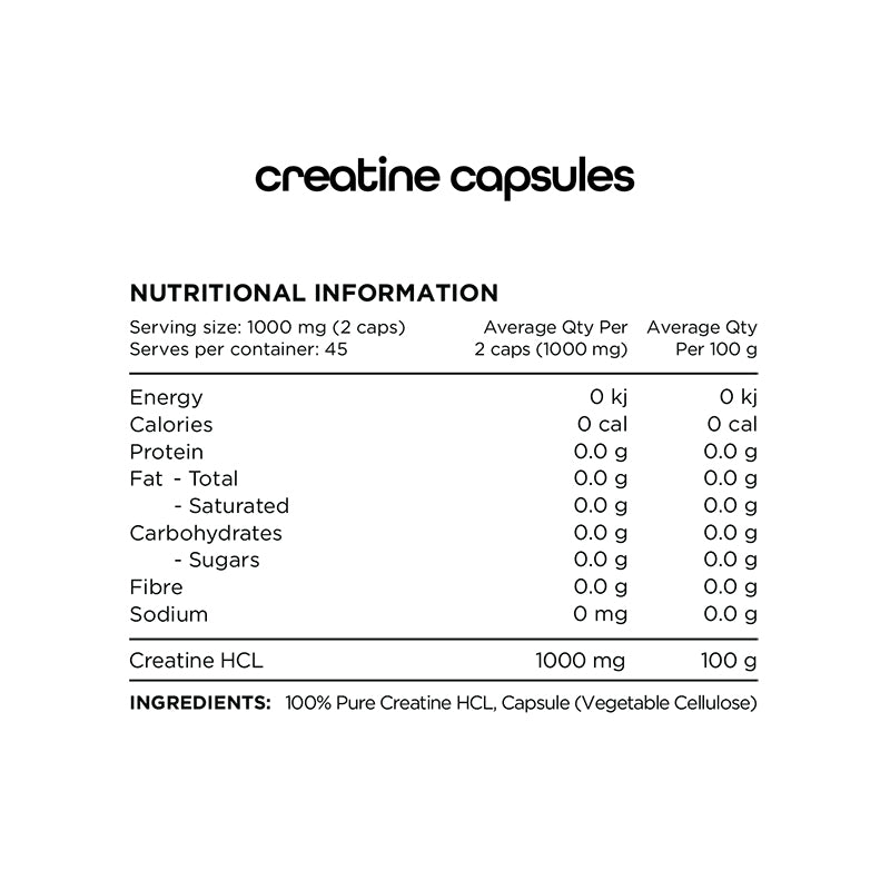 Formulated with no fillers, flavours, or unnecessary ingredients, these capsules contain only pure creatine HCL and a plant-based capsule shell.