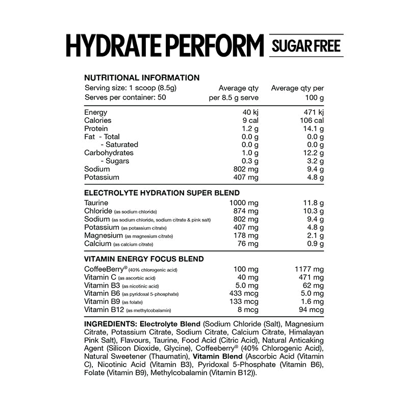 Electrolyte Blend (Sodium Chloride (Salt), Magnesium Citrate, Potassium Citrate, Sodium Citrate, Calcium Citrate, Himalayan Pink Salt), Flavours, Taurine, Food Acid (Citric Acid), Natural Anticaking Agent (Silicon Dioxide, Glycine), Coffeeberry® (40% Chlorogenic Acid), Natural Sweetener (Thaumatin), Vitamin Blend (Ascorbic Acid, Vitamin B3, Vitamin B6, Folate, Vitamin B12).