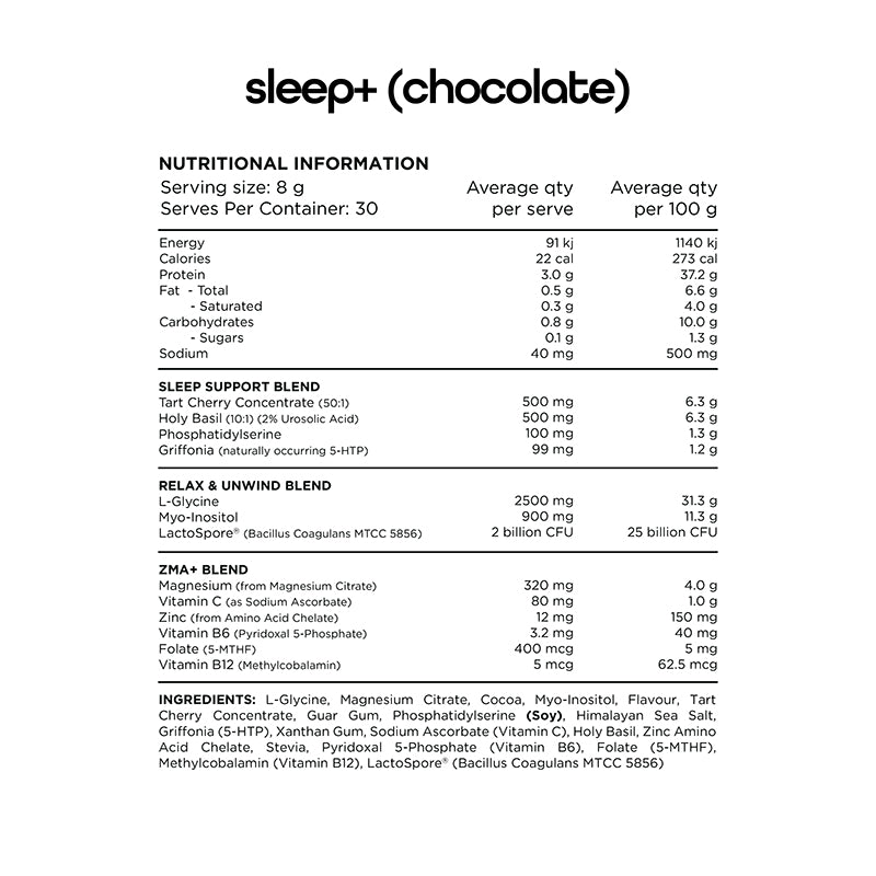 ZMA+ Blend: Sleep+ also features a unique ZMA+ blend containing Magnesium (from Magnesium Citrate) for muscle and nerve relaxation. Added Vitamin C acts as an antioxidant to protect cells, while Zinc supports cognitive and immune functions. B-Vitamins (B6, Folate, and B12) boost metabolic function and assist in melatonin bio-synthesis to ensure better sleep quality.