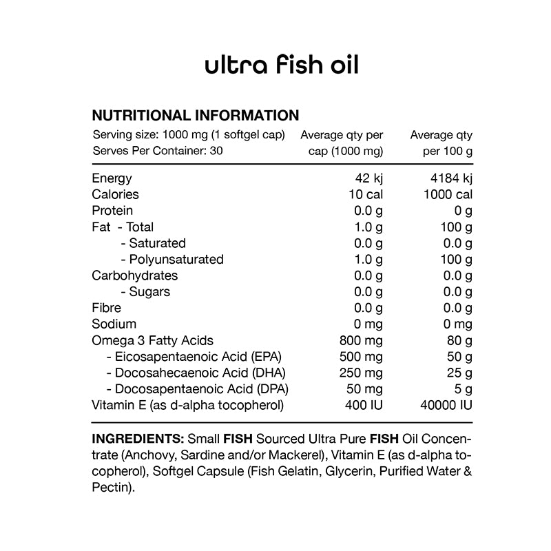 Each 1000mg softgel capsule is designed to fit seamlessly into your wellness stack, whether you’re looking to elevate your daily nutrient intake or simply prioritise clean, high-quality nutrition. With 30 softgels per tub and a flexible 1–3 capsule daily usage, it’s easy to tailor Ultra Fish Oil to your individual needs.