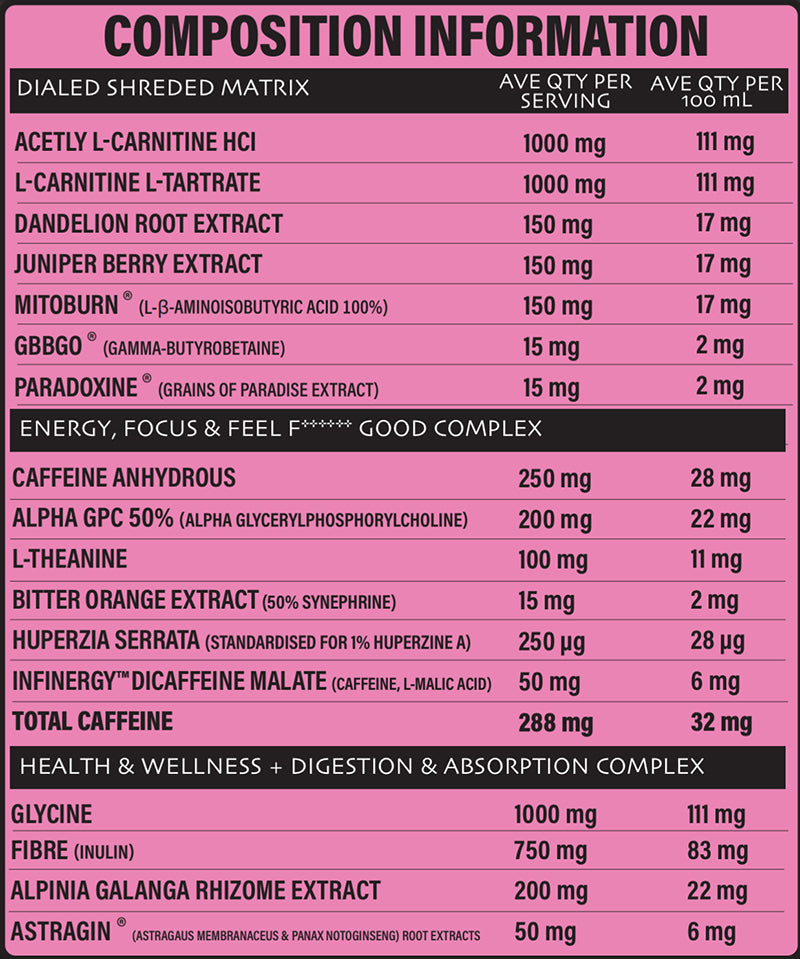 Dialed Shred features an Energy, Focus & Feel Good Complex, delivering a balanced and sustained energy boost to power through workouts or busy days. This thoughtful blend also helps you stay sharp and focused, ensuring you're ready to tackle any challenge without the dreaded crash.